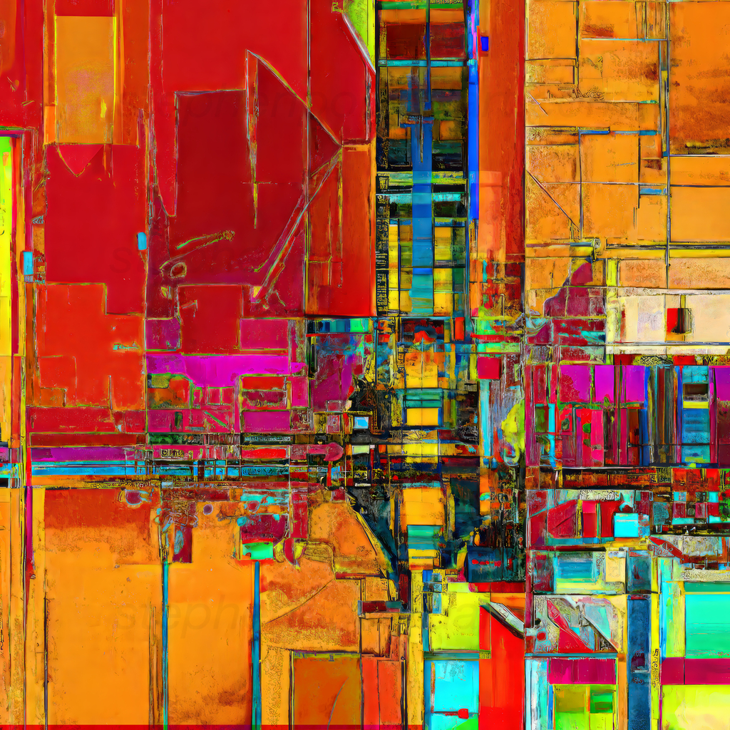 Stephen extracts and manipulates fragments of these images. He coaxes details out of contexts, distorting their scale and resolution. The results are further cut and pieced together. They are applied in layers on to bold colour fields, manually reassembled with ink, pastel and acrylics. The results are distilled, tangible hybrid versions of his original live creations.